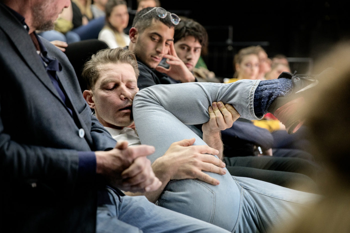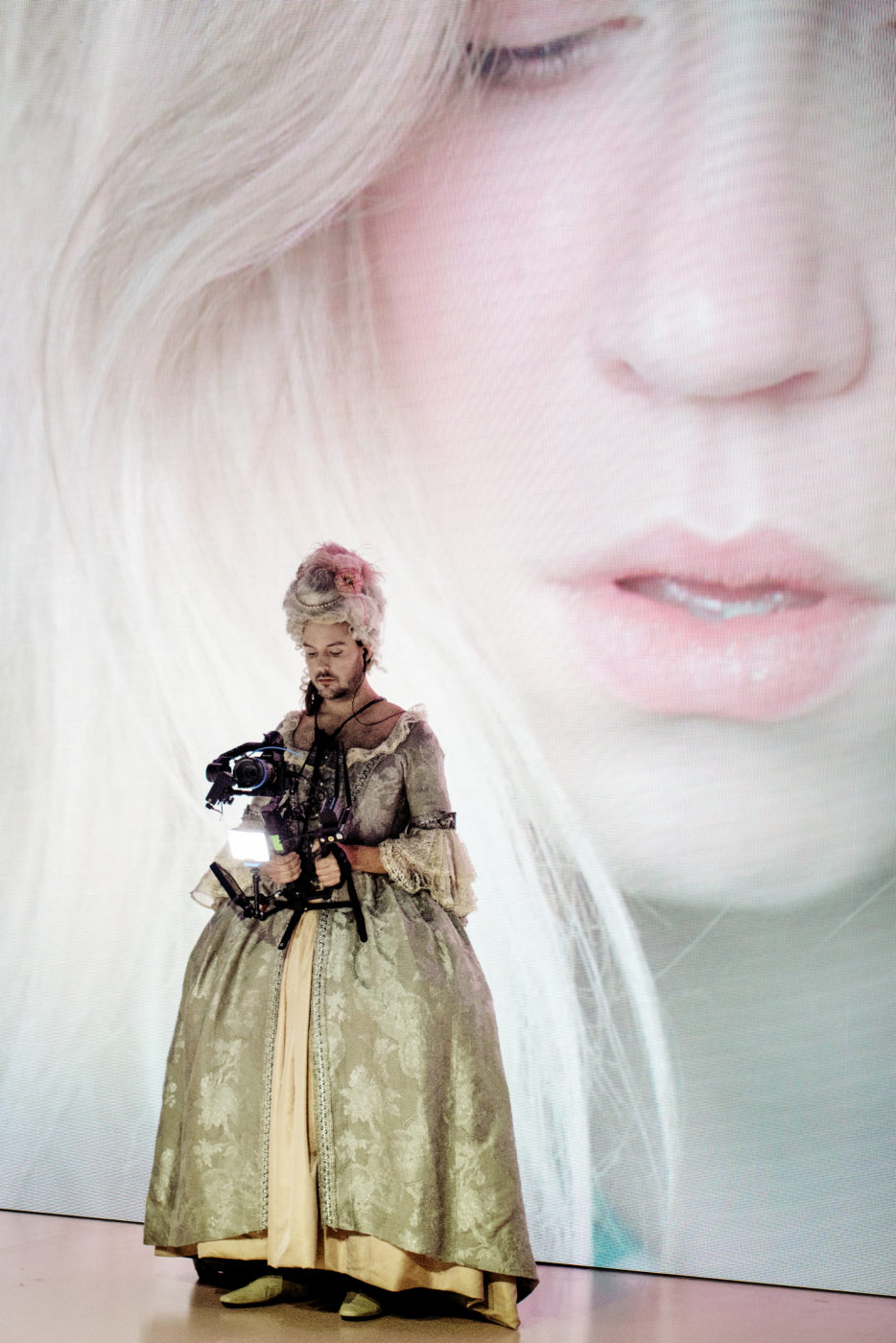 Jesper Just’s Cadavre Exquis was performed at Theatre Østerbro in March 2019 in Copenhagen. Its title refers to a game of losing control, made famous by surrealists. The rules of the game are simple: on a folded piece of paper that hides former inscriptions, each person in a group sketches a part of a body; once unfolded the co-produced work would compose a ‘cadavre exquis,’ an exquisite corpse made of diverse features and characteristics. In Just’s performance the folding operation was made by placing the audience opposite a gigantic screen onto which real time streamings of the audience were projected mixed with film recordings of audiences to other shows of the same performance. The screened material thus ‘folded’ past and actual time. Another folding was made up by the floor between screen and audience: separating screen and audience two men in Rococo costumes with cameras mounted onto their bodies slowly followed patterns drawn on the pink floor.[5] Acting as a kind of numb automata their camera lenses were directed towards the audience at all times. This intermediate pink space between screen and audience became filled at the ending with the ‘exquisite corpses’ of the two performers—a man and a woman. Their bodies were present in the audience, real time present at the screen and present in the footage from another performance.