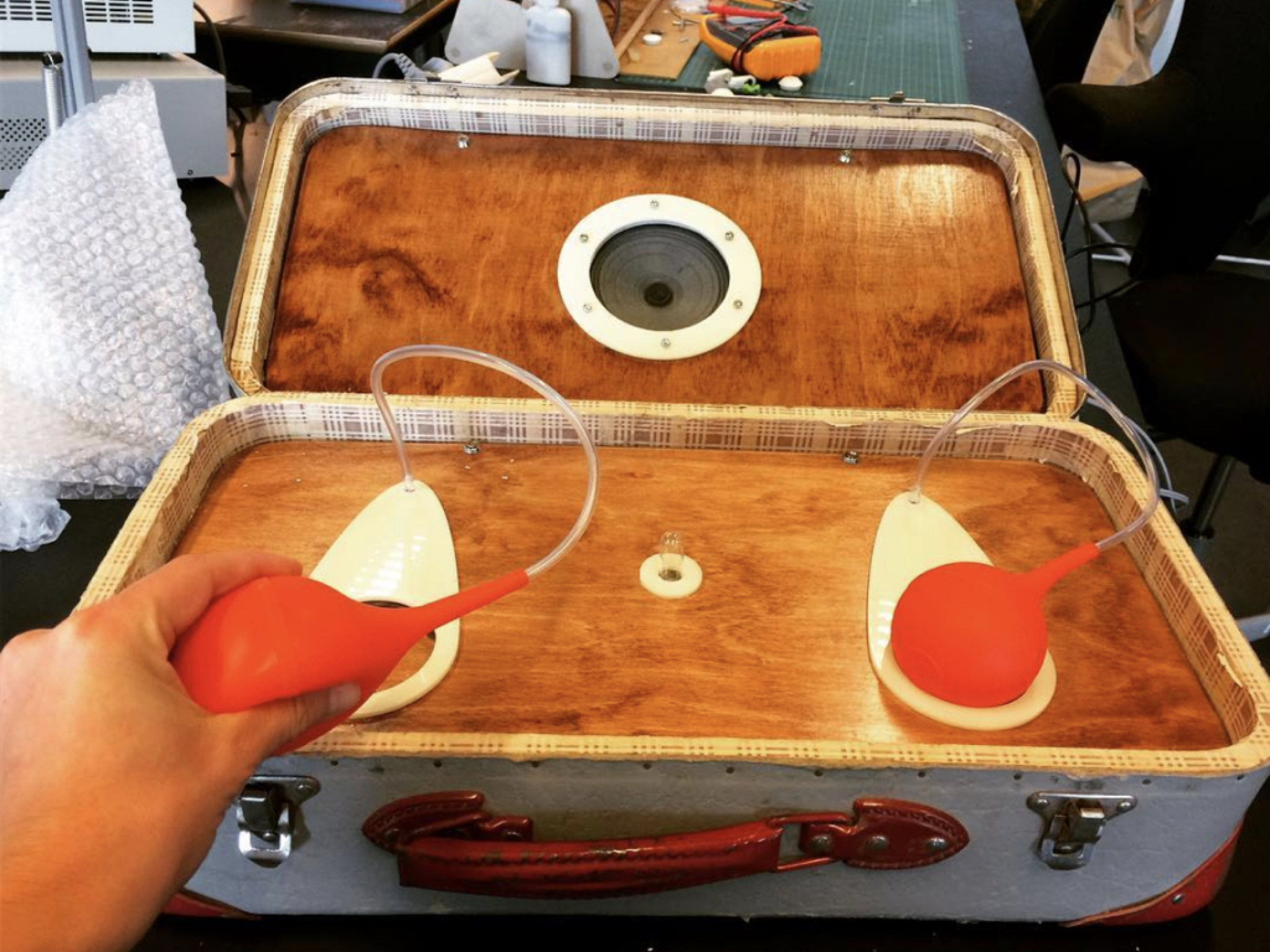 To facilitate experimentation of the mapping between interface and audio feedback, we decided to physically separate the interface and the audio playback. Thus, the final design of the Voice Pump consisted of two parts: a computer for sound-processing and a novel interface mechanism housed in a modified vintage suitcase (originally a carrying case for a 1962 East German vacuum cleaner). Communication between its parts is based on the standard OSC (Open Sound Control) protocol for networking electronic musical instruments and multimedia equipment.