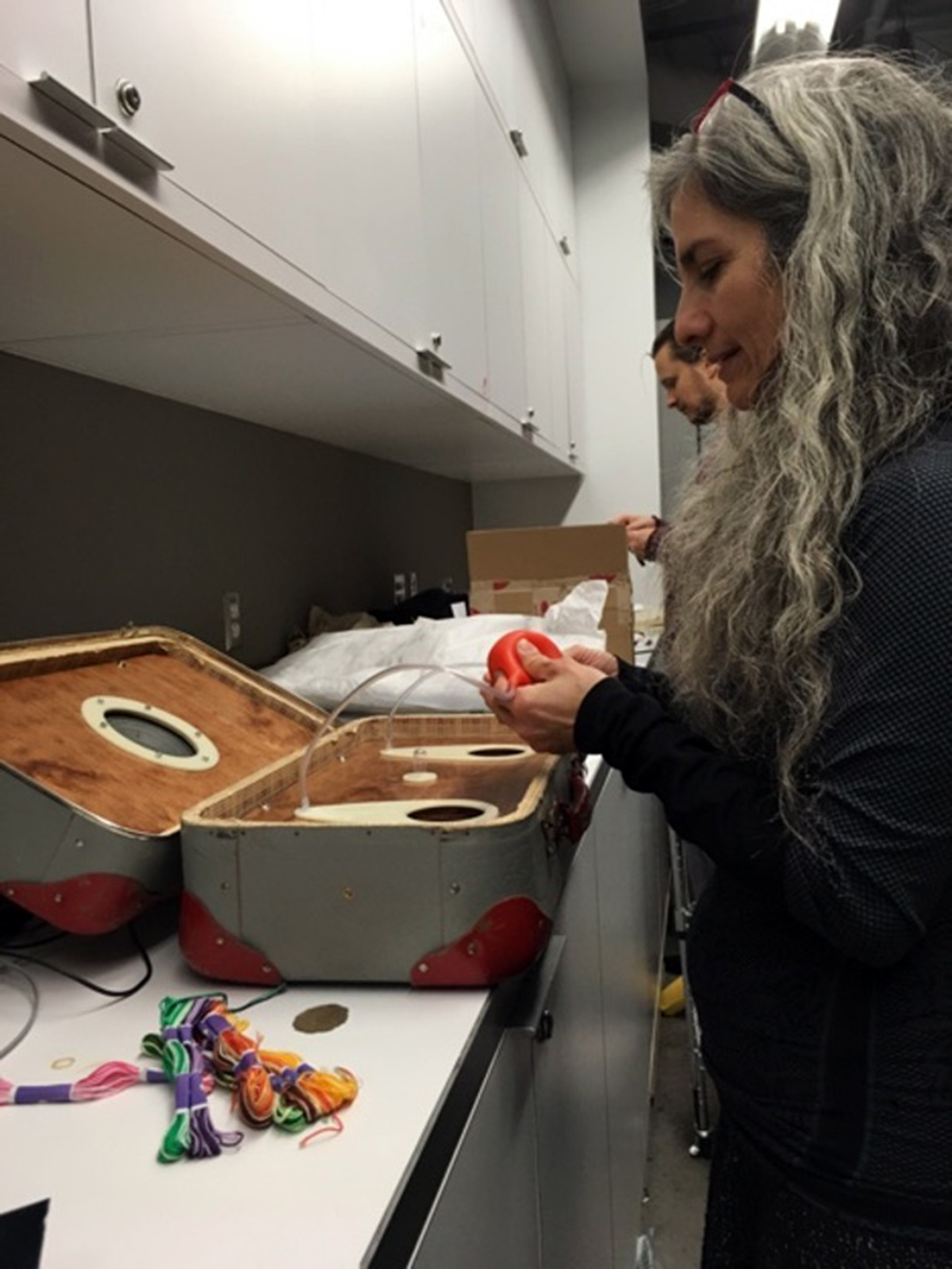 When trying out the interaction with the voices and the way in which they were modulated in pitch, we found that it was almost impossible to distinguish between gender and nationality; the voices would blur and intermingle until you would actually succeed in providing an appropriate amount of air into the pumps which could be achieved by gently squeezing the pumps continuously. Too little air, and the voices would sound like guttural utterances and eventually stop; too much air, and they would be squeaking.