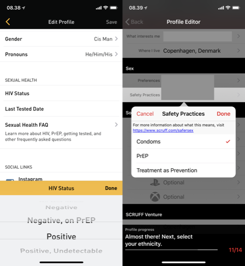 Figure 1. Disclosure options for “HIV status” in Grindr (left); and “safety practices” in Scruff (right).