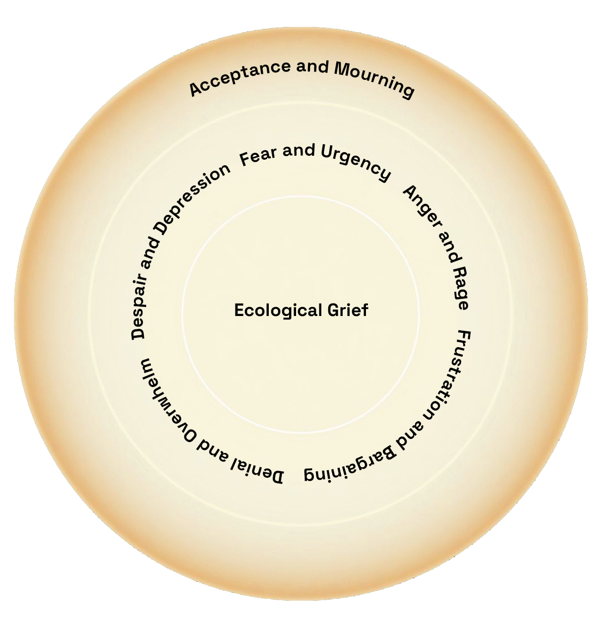 I have developed and iterated a model of ecological grief. The most current model (fig. 1) shows how each phase of grief fits into a cycle of practice: an embodied response that moves with us as we witness and anticipate climate-related loss. As such, my work frames grief not as a journey toward acceptance, but as a social practice of mourning where acceptance is continuous and not limited to environmental ruin—a process that holds the multitude of emotions that overlap and shape grief. This includes the loss of hope, faith in market-based solutions, resentment against institutions, frustration with political inaction, and the betrayal of greenwashing. I offer an understanding of “flat” affects (grief, depression, loneliness, sadness) as more than an individual, psychological, or diagnostic phenomenon in which grief is social and active. Grief informs and shapes how we understand climate crisis as a systemic problem that requires mourning ideas of the future and deeply held beliefs about our social realities.