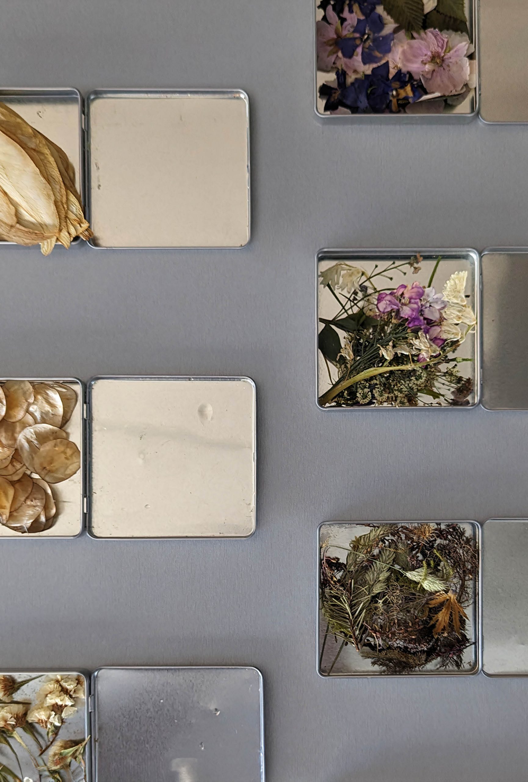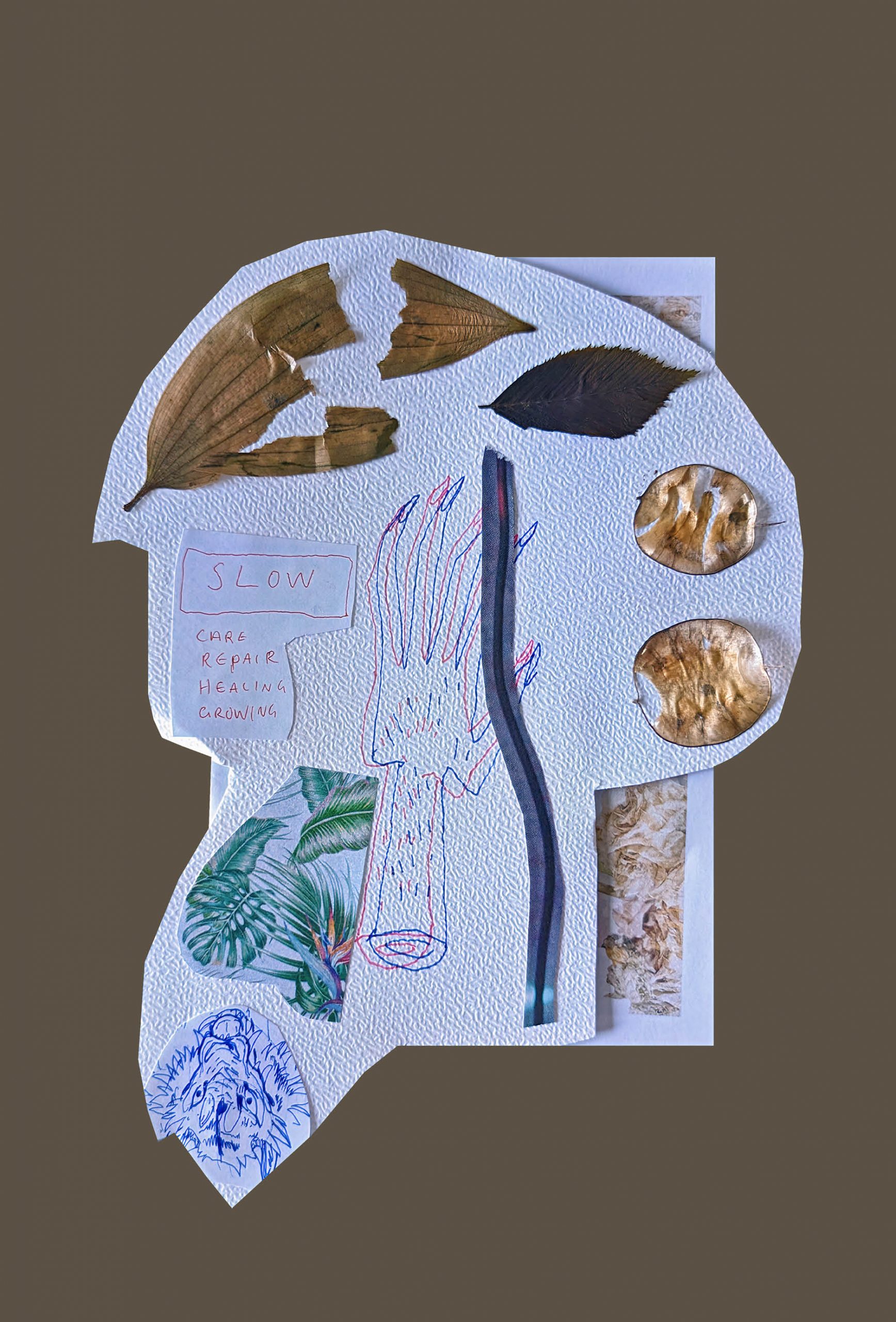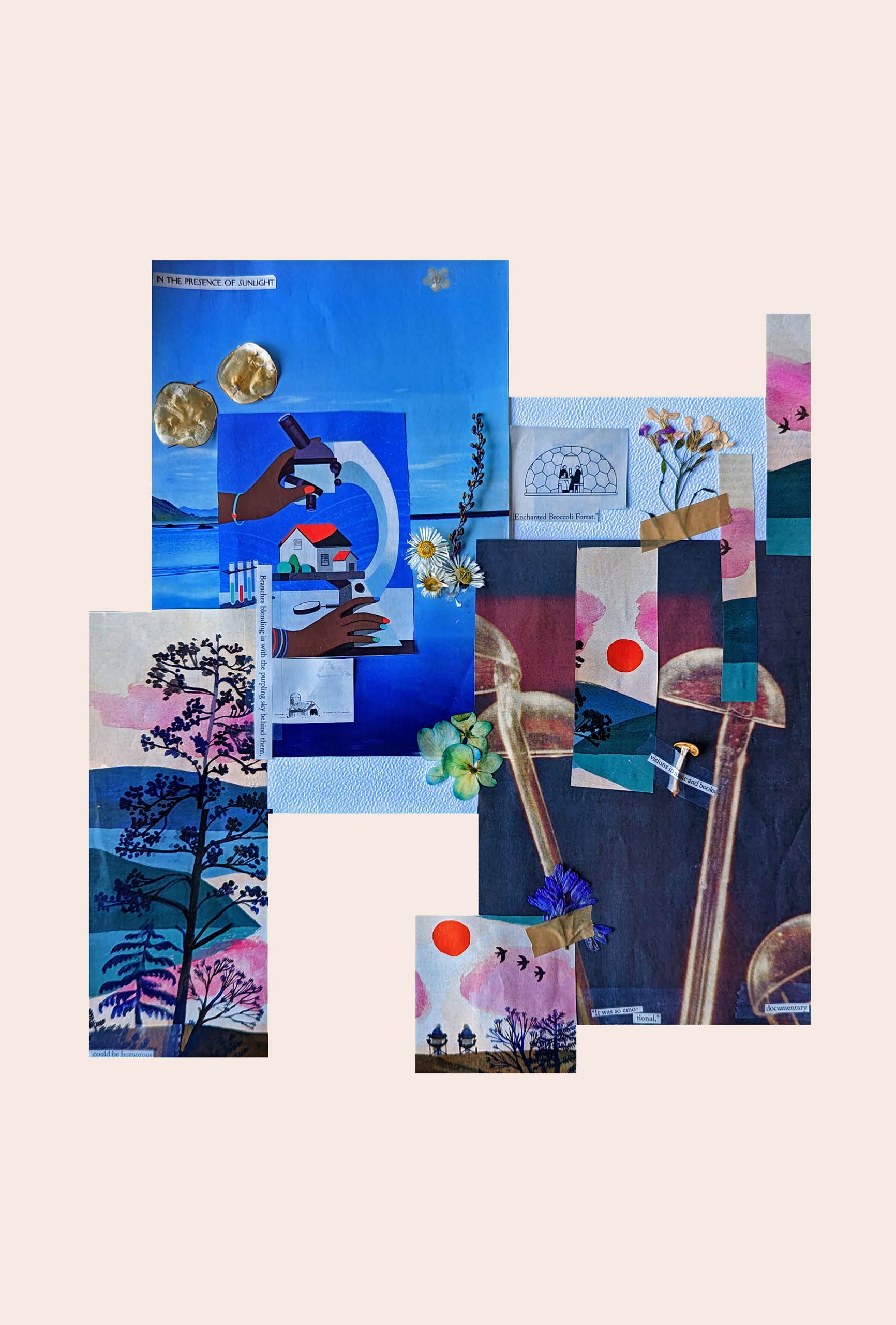 Collaging is a kind of scavenging practice. I forage for, grow, receive, and find flowers to press and preserve. I create with them through paper mâché, resin, canvas, paper, glass, and other recycled, found, and reused materials. It is a practice of making do with what you have and finding joy, pleasure, and beauty in working with dead and used matter. It is also a practice of grieving and imagination that moves me to pay attention to place by foraging, noticing growing patterns and irregularities, attuning to invasive species in my area, engaging respectful picking practices, identifying plants on walks, feeling the changes in the seasons when gardening, caring for plants, and preserving bouquets of flowers that I receive as gifts. These practices often require multiple days if not weeks and months. In my everyday life, these durational habits orient me to the world around me. They are not methods of extraction, production, or consumption. I work with what I already have, what I am gifted, and what can be reused.