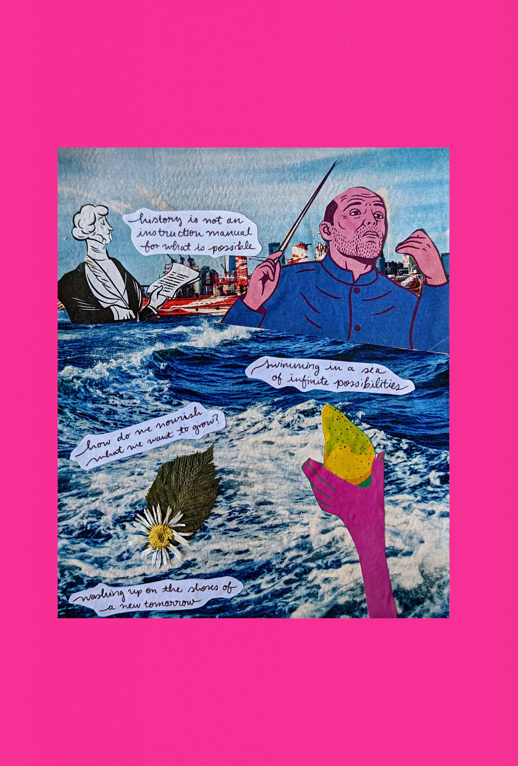Choose a keyword below to write with: how does the word texture your visions? You can write a burst of theory, a story, poetry, a list. Whatever comes to mind. Write for 15 to 20 minutes, then begin to use your writing for a collage piece. You can use any of the materials provided (including your writing) to create a mixed medium piece to express, reflect, and materialize your vision. In a workshop context, we do not have weeks or months to craft together. But just as I might forage in my garden, a patch of grass, on a walk, or in a park, you might “forage” for meaning, representation, and materials in collage materials: magazines, scraps, odds and ends.