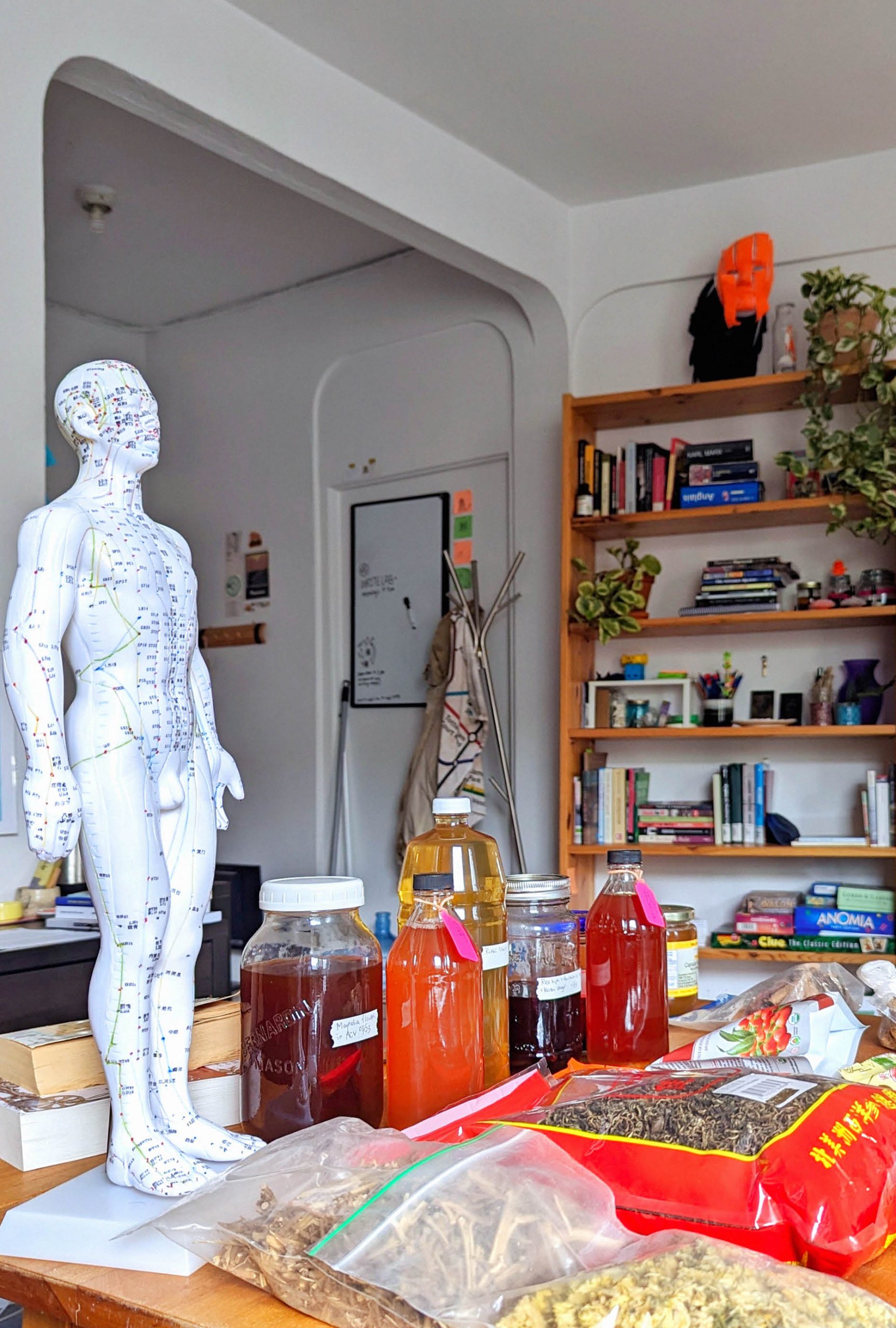 Just as we talk about a river in an ecosystem, we can speak of meridians. They are made of the same thing: Qi. Body is land and the land is our body. The six channels are internally and externally linked. Dogs have meridians. Plants have meridians. Even a river has a Xi (cleft) point. When we come into balance we bring the world into balance. Much like a terrestrial ecosystem needs soil and its intermediaries—minerals, carbon, nitrogen, fungi, bacteria—we too need the same. Our bodies, for example, rely upon hemoglobin proteins to oxygenate blood and allow for cellular respiration. At the centre of hemoglobin, acting almost like an organic crystal, an iron ion charges, facilitates binding to oxygen. Similarly, plants rely on chlorophyll to accomplish a similar binding: magnesium and carbon dioxide. Mirroring bodies. We can couple relationships of body and land through herbal medicine.