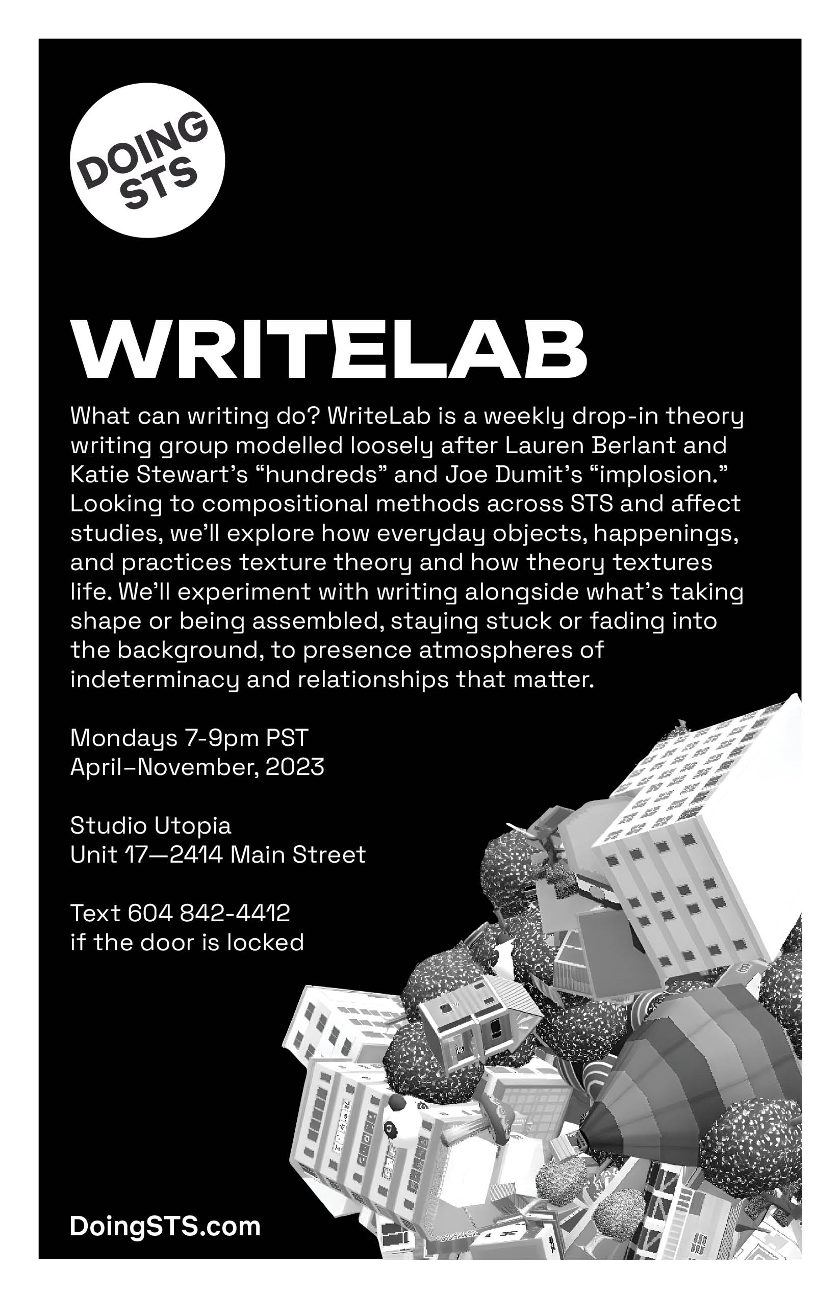 What can writing do? From March to October of 2023, we met weekly on Monday nights to write. Looking to compositional methods across STS and affect studies, we explored how everyday objects, happenings, and practices texture theory and how theory textures life. We experimented with writing alongside what’s taking shape, being assembled, staying stuck, or fading into the background in order to presence atmospheres of indeterminacy and hone capacities of noticing. We took compositionality to be both how the world works and an ordinary science: material-semiotic things thrown together or taken apart.