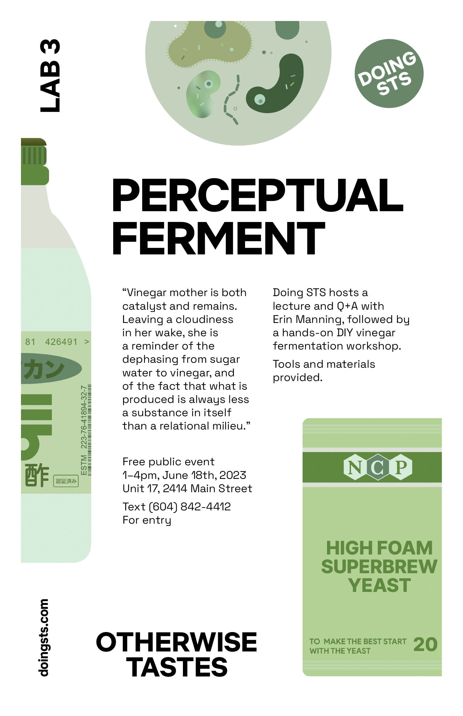 The feel is alive with perceptual ferment. Condiment, preservative, beverage, both culinary and medicinal, the slow-ferment of the age-old practice of making vinegar takes at least 75 days to metabolize the sugar and produce a high enough acid content to be considered acetic. But it is not a hard science. Mostly you go by taste. And in the tasting, there will necessarily be variation, imbued as the process of transduction is with the question of how to ascertain an absence. How to taste sugar’s disappearance? How to feel what has dephased into its difference from itself? How to recognize the turn the mixture has taken as complete?