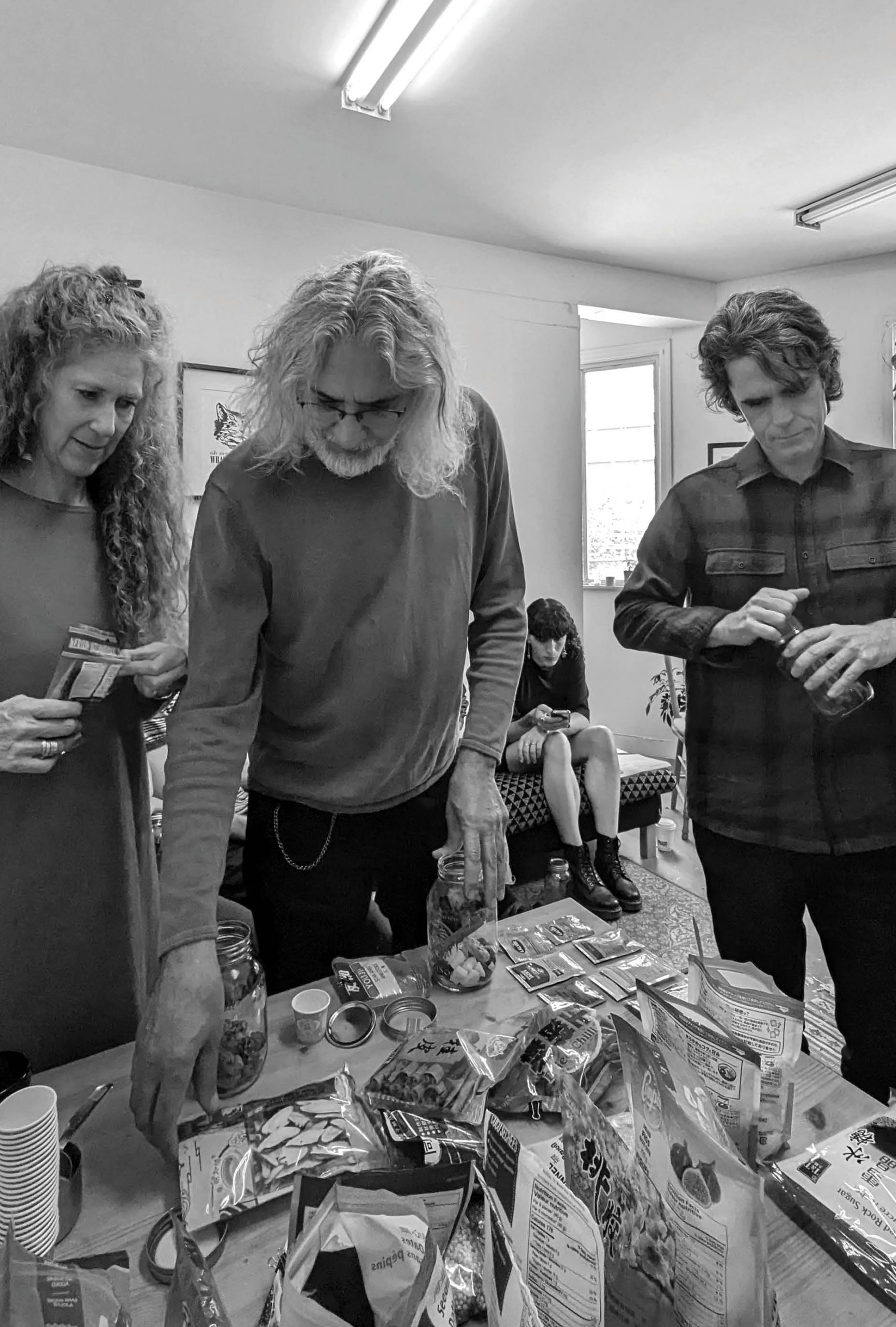 Mother is both catalyst and remains. Leaving a cloudiness in her wake, she is a reminder of the dephasing from sugar water to vinegar, and of the fact that what is produced is always less a substance in itself than a relational milieu. In an ethos of a poetics of relation, the mother is the irreducible share of a process still underway. She is the trace the process produces and leaves behind. She can be excised from it, but the ensuing milieu will always carry the effects of her having been constituted by it. And when she is fed into new sugar solutions—new vinegars will be seeded by her metabolizing presence—she will continue to produce more of herself, which is to say, more potential for transduction, the activity of transformation whereby mixtures individuate, subsequently producing dephasings that activate new processes. And though products will emerge—vinegars with singular tastes, textures and perfumes—these (like all products) will never be able to be returned to the sum of their parts, will never be reducible to the sugar water they once were. They will always carry the effervescence that fostered their transduction.