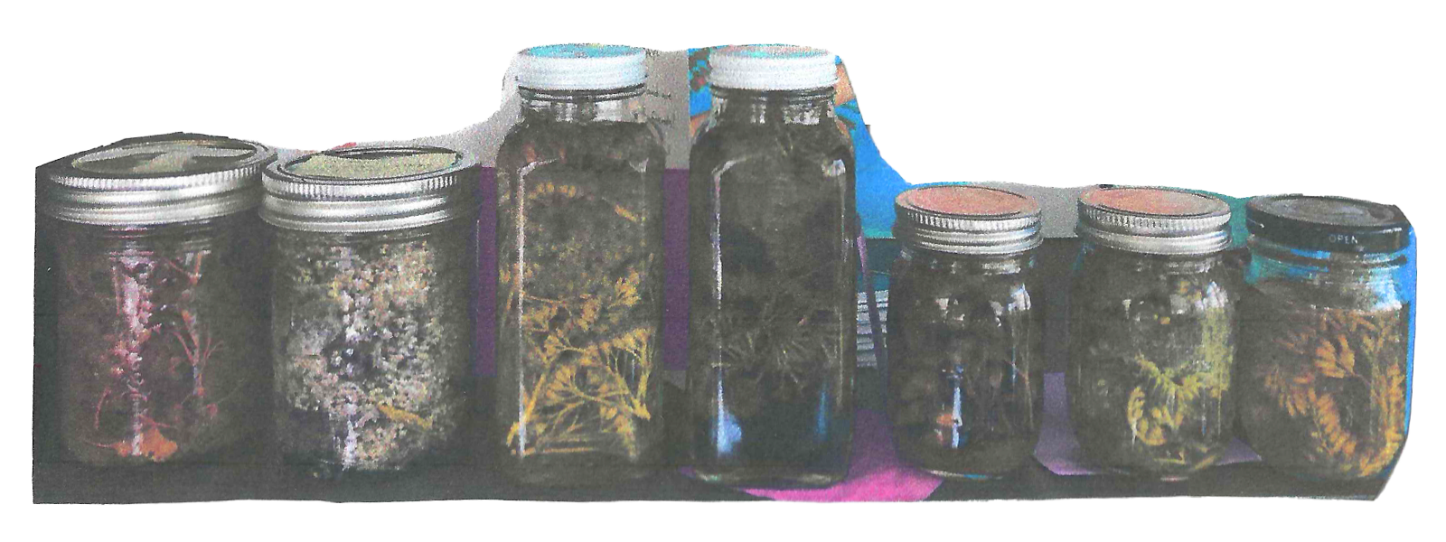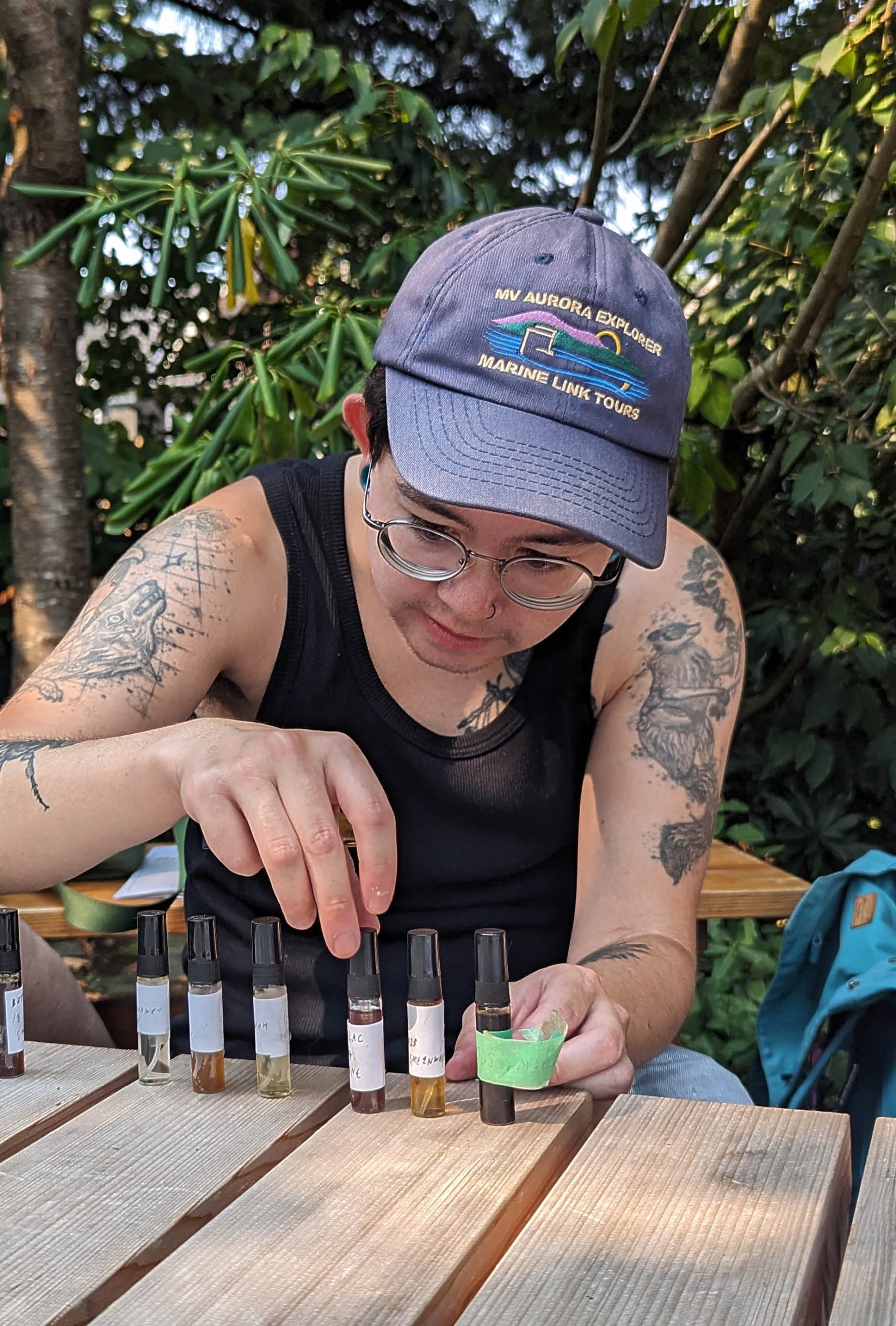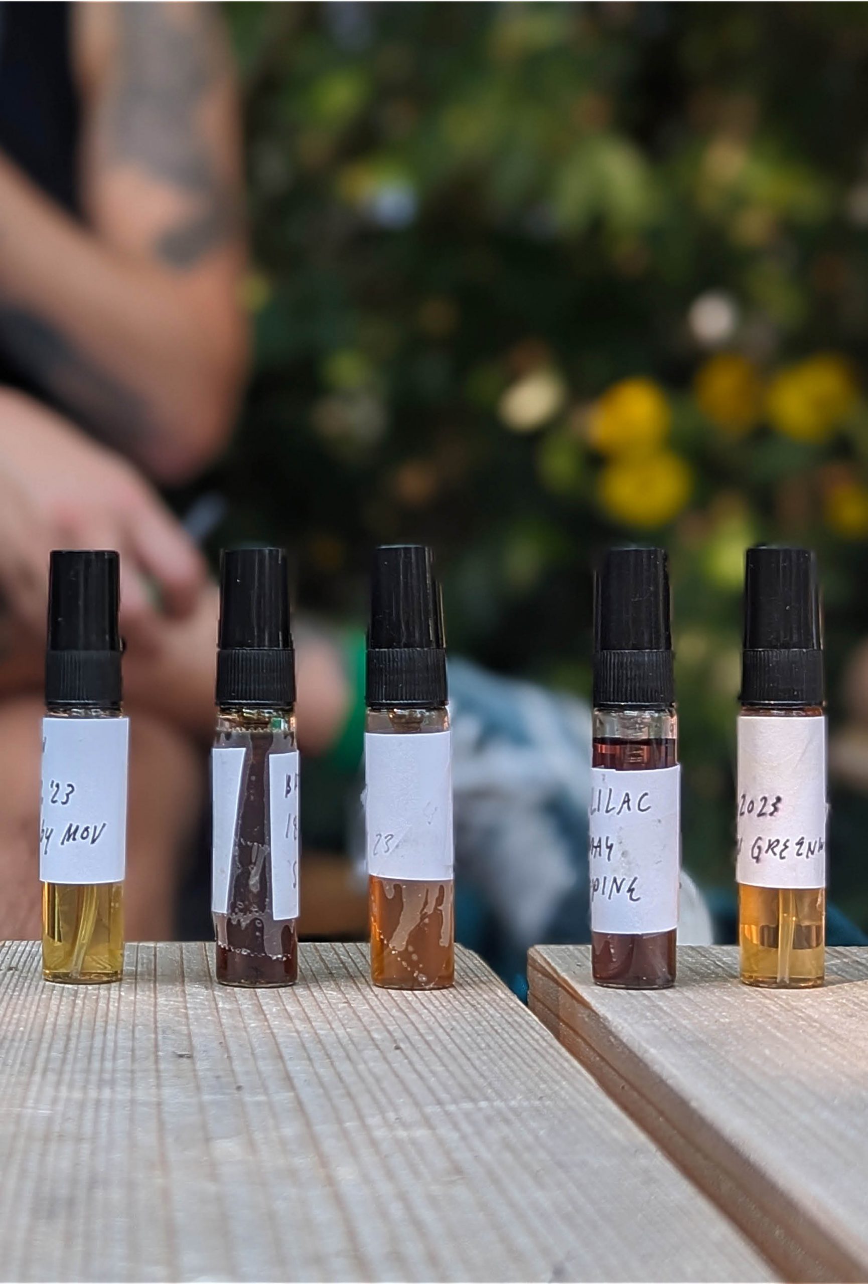Tincturing archives place through scent. Through covering organic materials in grain alcohol, sugars and starches “act as a fixative, trapping scent molecules and slowing evaporation" (Arthur 2023, 7). Collecting smells over a season and letting them extract and saturate alcohol over time is one way the ephemerality of smell might be isolated, preserved, and transformed. Returing to tinctures as they age enables a kind of return, evoking place, the organic entity, and seasonality all mixed together with a practice derived from portable acts of attention. This capture and conversion can then be shared.