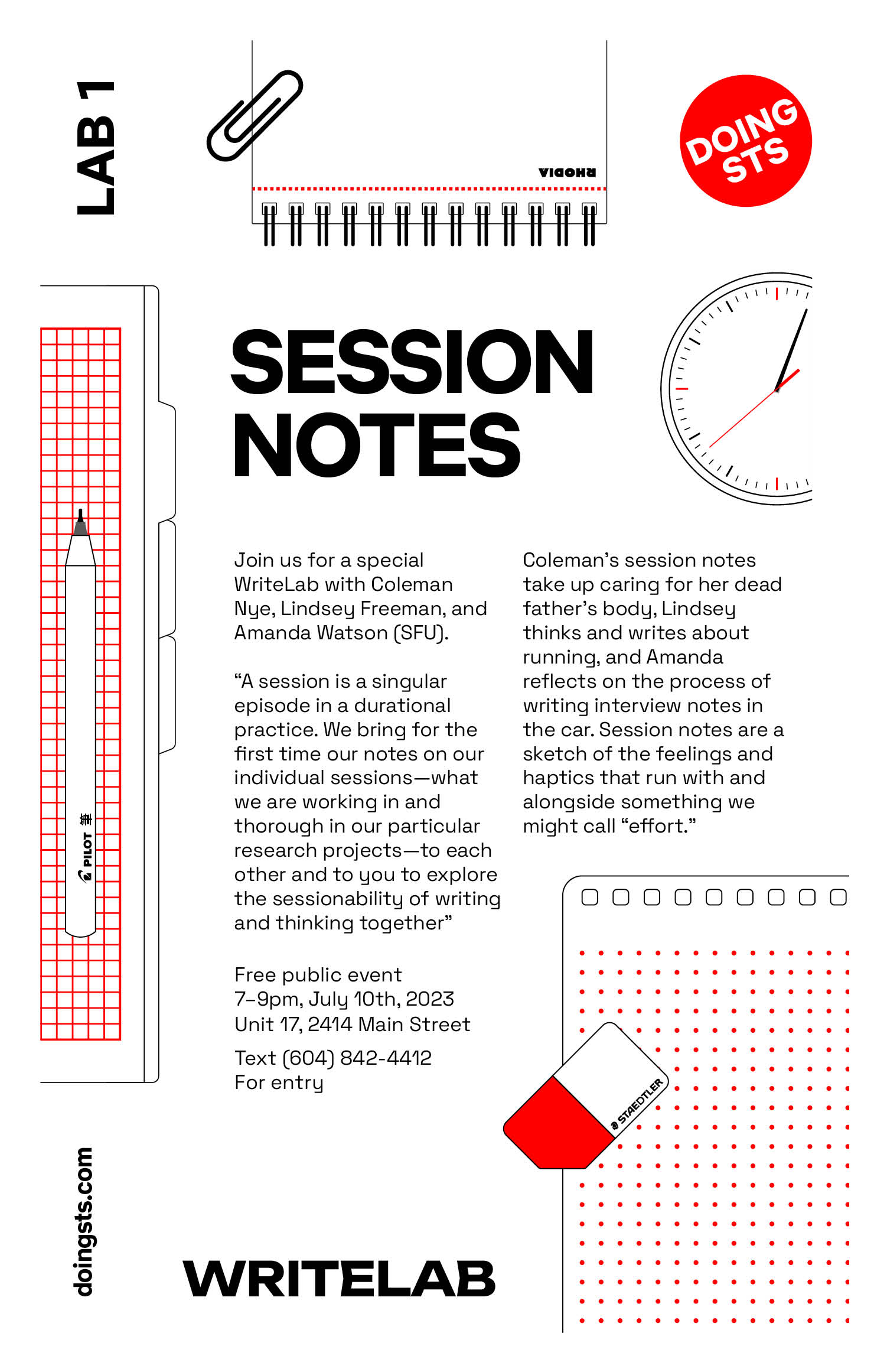 Coleman’s session notes take up caring for her dead father’s body, Amanda writies interview notes in the car, and Lindsey is still thinking and writing about running and the work that session notes can do not only as a record of times and distances, but also when taken up together, as a conspectus of the feelings and haptics that run with and alongside something we can call for simplicity sake, effort.