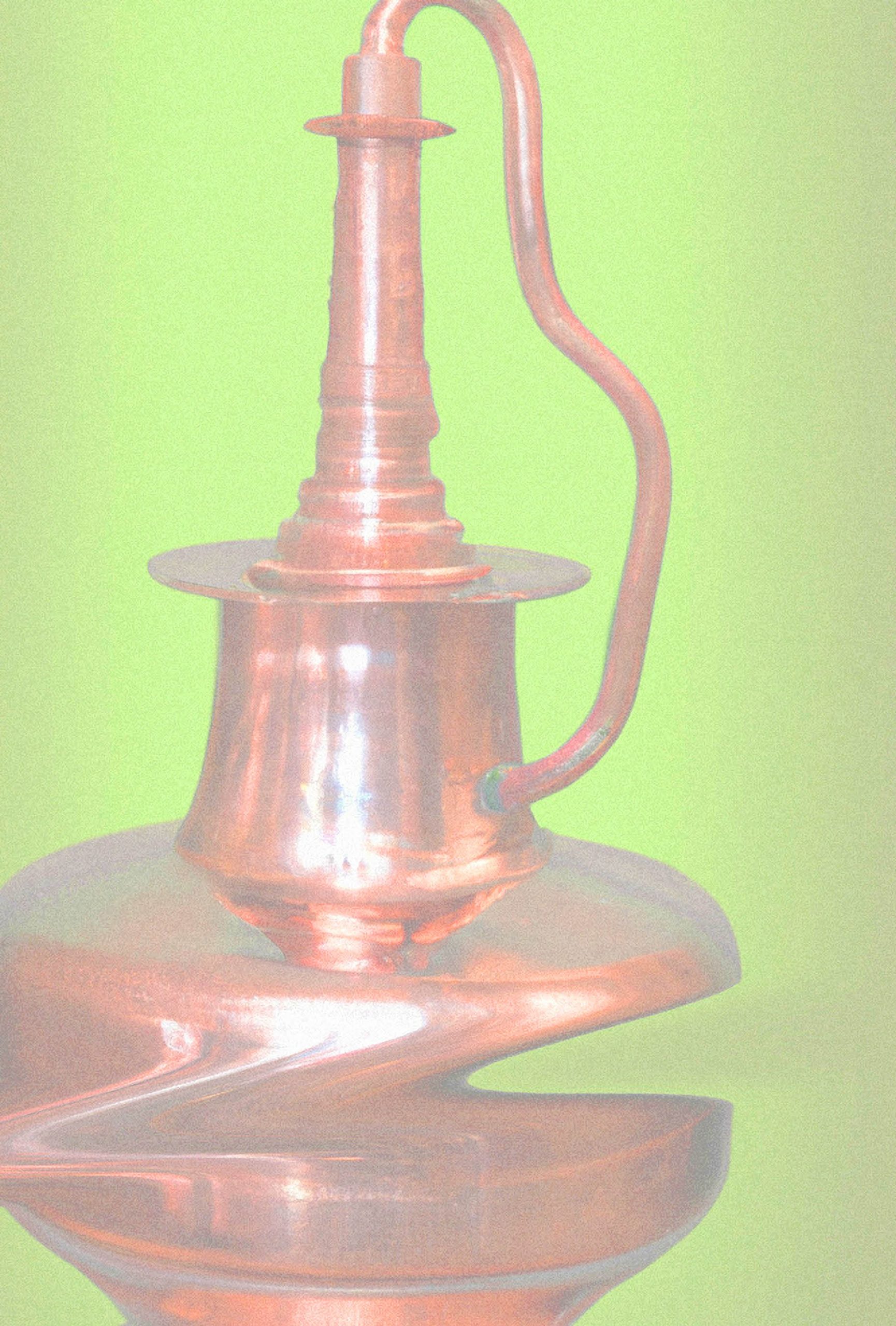A copper alembic still has four components: a pot for boiling water, a column which sits on top of the pot and holds materials, a cap covering the column to direct vapour down the condenser coil, and the coil unit itself. An additional tube may be included that sits between the cap and the coil. First, fill the still’s pot with water. Leave an inch of headroom. Pack the column loosely with materials. Do not use powdered material—the cap can clog and cause an explosion. Connect vinyl tubing to the bottom spout on the back of the condenser coil. Affix the other end to the outflow of the aquarium pump which is to be placed in a large tub or bucket filled with cold water. The pump will push water up through the bottom of the condenser and overflow from the second spout above. Instead of a pump, you can manually feed ice or cold water into the condenser—but must do so continuously during distillation. Connect another piece of tubing to the top spout with the free end draining into the tub. Finally, place a glass collection vessel below the outflow spout on the coil unit. Teflon can be used to further seal the joints between components. Now, bring the pot to a boil and watch for the distillate. Monitor closely to ensure the still does not clog or run out of water. Separate the oil from the hydrosol using a pipette or separatory funnel. The oil can be used in any oil or alcohol-based perfume formula. Hydrosol is used alone and should be refrigerated.